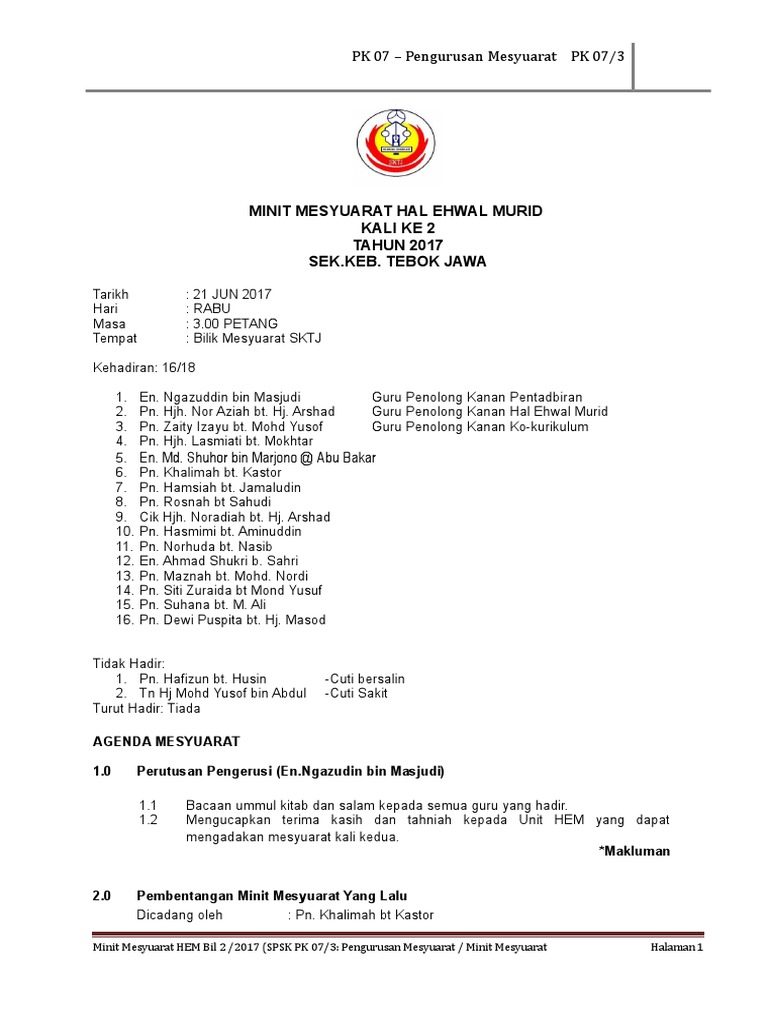 Bob sirajul mohd zuki rohaiza marzuki ucapan pengerusi i. Jika tiada catatan, segala perbincangan tidak akan ada tindakan susulan. Download lagu minit mesyuarat hem kali 1 mp3 dapat kamu download secara gratis di metrolagu. Adakah ini kali pertama anda ditugaskan untuk mencatat minit mesyuarat? 5.3 selepas perbincangan, menu rmt diterima dengan sebulat. Berikut adalah kandungan mesyuarat / agenda yang perlu ada dalam mesyuarat pbs. 1.0 ucapan pengerusi 1.1 ucapan aluan daripada puan guru besar dan mengucapkan selamat kembali bertugas ke sekolah. Untuk menghasilkan minit mesyuarat, jangan ambil mudah dengan format minit mesyuarat, kerana format ini amat penting untuk menghasilkan minit mesyuarat yang betul. Bilik mesyuarat a17 kehadiran ahli : By zai muhd 2243 views. 15 mac 2020/ rabu masa : Contoh minit mesyuarat yang nak dikongsikan ini adalah selaras dengan garis panduan kementerian pendidikan malaysia. Minit mesyuarat panitia tmk kali kedua 2017.