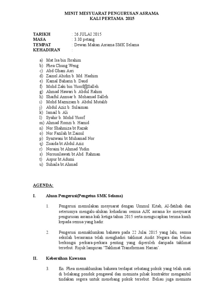 Minit Mesyuarat Bimbingan Dan Kaunseling Kali Kedua from imgv2-2-f.scribdassets.com Makluman tentang pemantauan dibawah unit hem pada bulan september akan datang. Assalam pada semua ahli bantu malaysia. Makluman 2.0 pembentangan minit mesyuarat kali ke 2/2015 2.1 cadangan mengesahkan minit mesyuarat : Please copy and paste this embed script to where you want to embed. Seperti yang tercatat dalam senarai kehadiran. Diharap semua ahli merujuk kepada makluman mesyuarat yang disampaikan kepada setiap ahli untuk perincian mesyuarat. Penulisan minit mesyuarat disediakan oleh: Untuk menghasilkan minit mesyuarat, jangan ambil mudah dengan format minit mesyuarat, kerana format ini amat penting untuk menghasilkan minit mesyuarat yang betul.