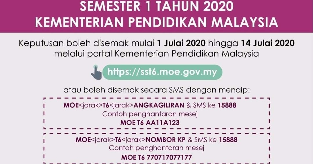 Kementerian pendidikan malaysia (kpm) telah mengeluarkan senarai nama yang ditawarkan untuk menyambung pengajian ke peringkatan tingkatan 6 untuk. Permohonan tingkatan 6 stam kini dibuka. Semakan tawaran tingkatan 6 ini boleh disemak dengan 2 cara iaitu secara online atau melalui khidmat pesanan ringkas (sms). Cara semakan keputusan tingkatan 6 2020. Untuk makluman, keputusan tawaran kemasukan ke tingkatan 6 di sekolah menengah bantuan penuh kerajaan boleh di semak menerusi sistem aplikasi semakan portal rasmi kementerian pendidikan malaysia. Panduan buat mereka yang ingin menyambung pelajaran pasca sijil pelajaran malaysia (spm). Pelajar yang ada memohon kemasukan ke tingakatan 6 boleh membuat semakan keputusan permohonan tingkatan 6 secara online dan sms selepas ianya diumumkanpelajar lepasan spm 2018 boleh membuat semakan tawaran ke tingkatan 6 sesi 2019/2020 di sekolah menengah bantuan. Maklumat bagi tahun 2021 akan dikemaskini. Bilakah tarikh semakan tawaran tingkatan 6 tahun 2020? Info lanjut sila baca di sini dengan teliti. Sehubungan dengan itu,semakan tawaran kemasukan dan pendaftaran kemasukan ke tingkatan enam semester 1 tahun 2020 akan dimaklumkan pada satu tarikh yang akan ditetapkan selepas pkp dan pkpb tamat. Semakan tawaran keputusan tingkatan 6 tahun 2021 secara online dan sms. Membuat rayuan jika anda tidak ditawarkan tempat di tingkatan 6 bawah.